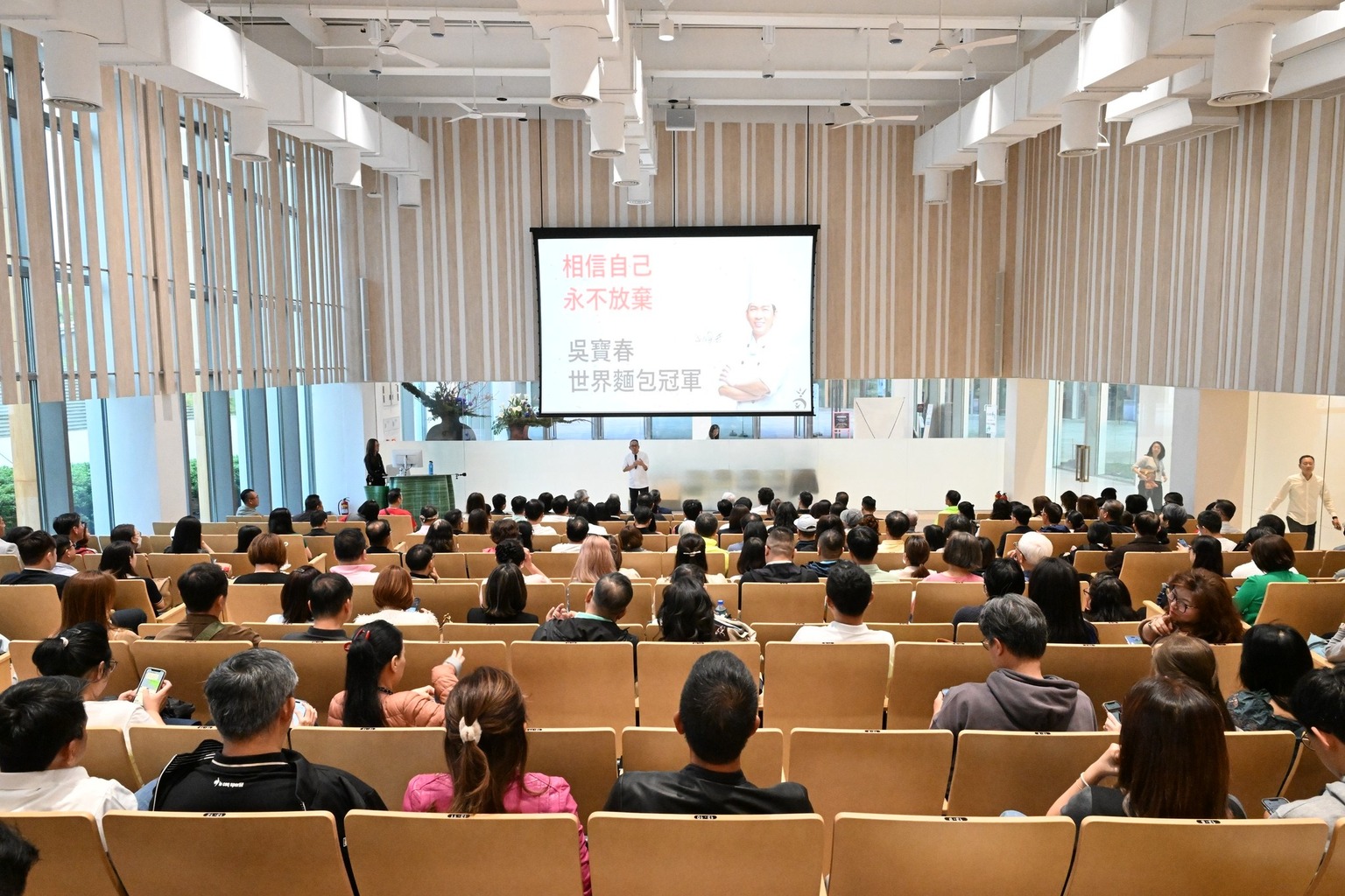 演講中有幾個片段令我非常感動。其中一個是他提到,在獲得全球冠軍回國後,接受了總統的接見的故事。他提到當時走在總統府的二樓廊道,當看向窗外見到中正紀念堂的那一剎那,他彷彿見到17歲時候的自己。17歲時候的是什麼樣子的呢?當時他在麵包店當學徒,難得的假日,為了讓自己在僅有的休假日補充睡眠,他離開宿舍搭上公車,只為尋得一處能安靜休息的地方,中正紀念堂圍牆邊的樹蔭下,就是他小憩的位置。當寶春師傅提到這一段時,那個畫面非常清晰。那位獲得國際大獎肯定的男人,見到了17歲時青澀、懵懂又努力的自己,心中或許有很多心疼與觸動,但也有著對過去那份努力的感謝吧!另外是關於原本不擅長閱讀的他,在友人的協助與指導之下,開始廣泛地閱讀。甚至為了讀懂日文的麵包食譜書,報名參加日語的補習與培訓;也因經營事業所需,從學習閱讀財務報表、經營策略開始學習,最終取得新加坡的碩士學位。